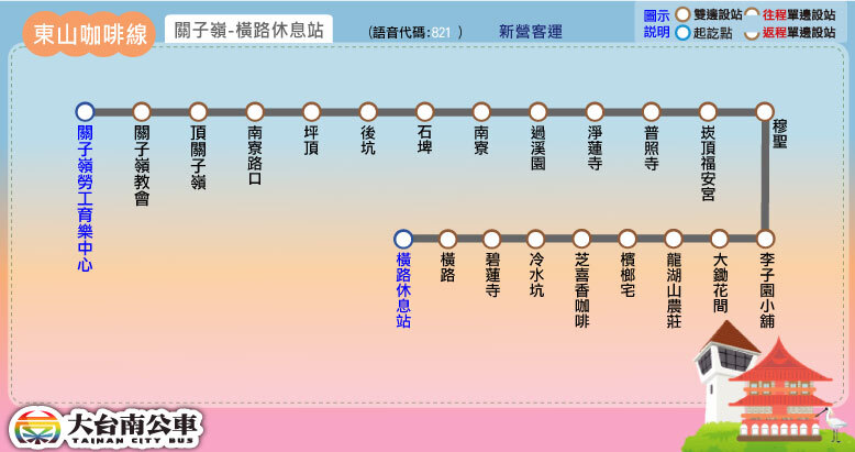 公車時刻表資訊,請於「大台南公車」查詢相關資訊:https://2384.tainan.gov.tw/NewTNBusWeb/othersInfoTimePrice.html?Lang=cht&pathId=1821