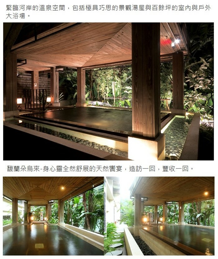 一個離都市最近的世外桃源。饒富亞熱帶島嶼意趣的飯店,在館內可見到池水緩緩溢流至碧綠的湖中並與南勢溪連成一氣,提供您精緻悠閒且不受干擾的渡假環境。緊臨河岸的溫泉空間,包括極具巧思的景觀湯屋與百餘坪的室內與戶外大浴場。在一個最貼近自然的SPA個人專屬芳療空間裡,更能享受到專業貼心的芳香療程服務。