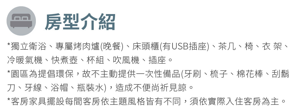 3. 依房型預定增加一人費用。3-6歲$1000/人(含早餐、DIY手作),7-12歲$3500/人,13歲以上$4500/人,寵物$1000,每房最多加兩人入住。