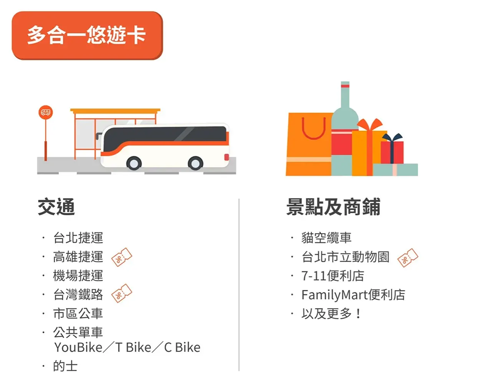 【台灣交通必備悠遊卡】適用交通工具(享有優惠)、便利商店支付、公共腳踏車租借等,讓你不用再攜帶零錢排隊購票,輕鬆交易付款、快速上下捷運/公車,還能夠在各大超商(7-ELEVEN、全家等)重複加值、購物!一張在手全台漫遊!