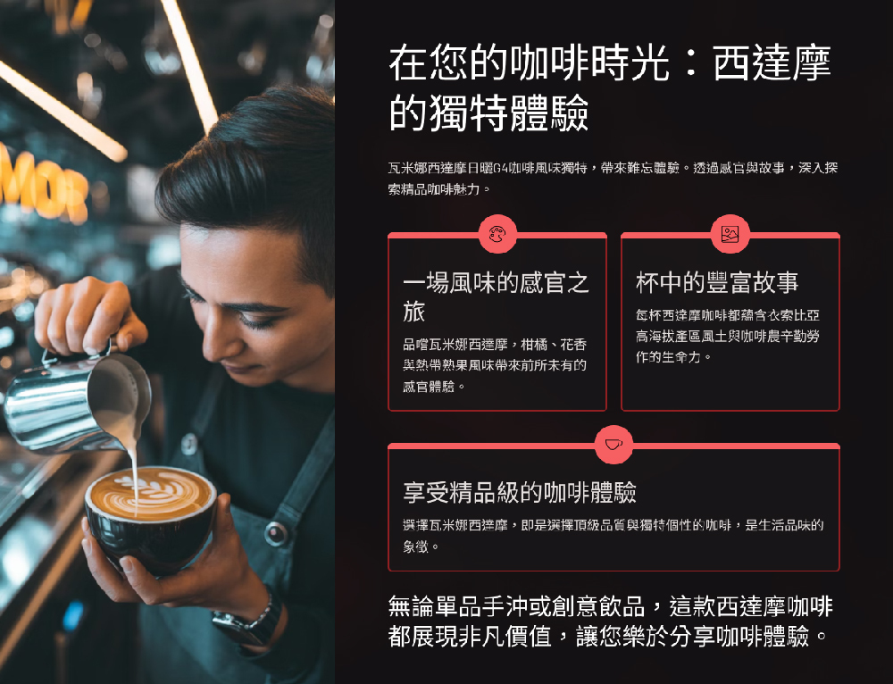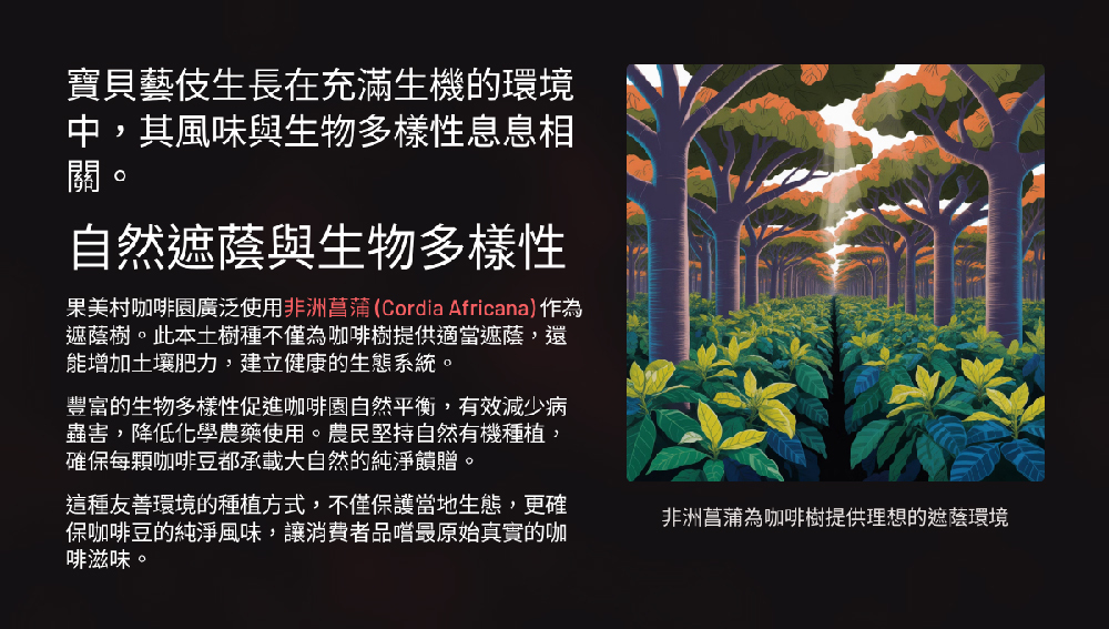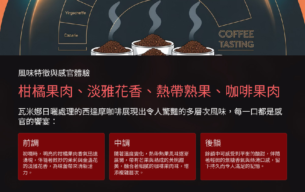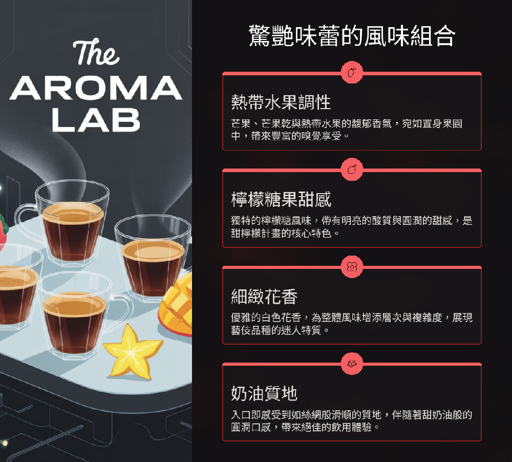 可能展現的品嚐風味:芒果、芒果乾、檸檬糖、熱帶水果、咖啡熟果、葡萄、白色花香、甜奶油