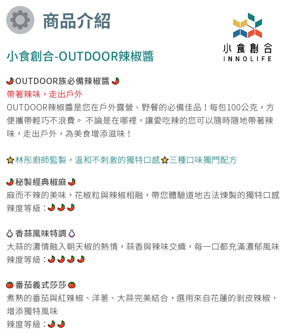 品名:小食創合 OUTDOOR辣椒醬 ❲祕製經典椒麻❳