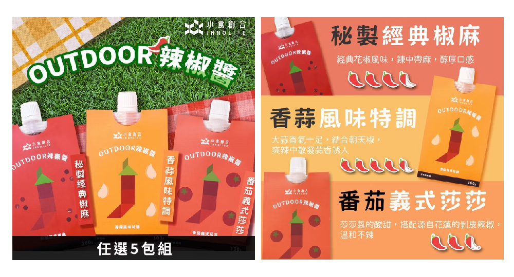 1.憑券可兌換小食創合【OUTDOOR辣椒醬】任選3入組,請於下單時備註口味。