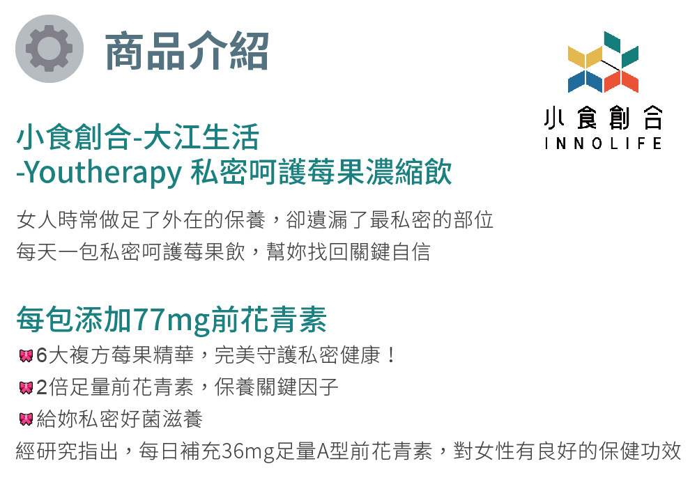 品名:【大江生活】Youtherapy私密呵護莓果濃縮飲 內容量:25毫升/包,10包/盒