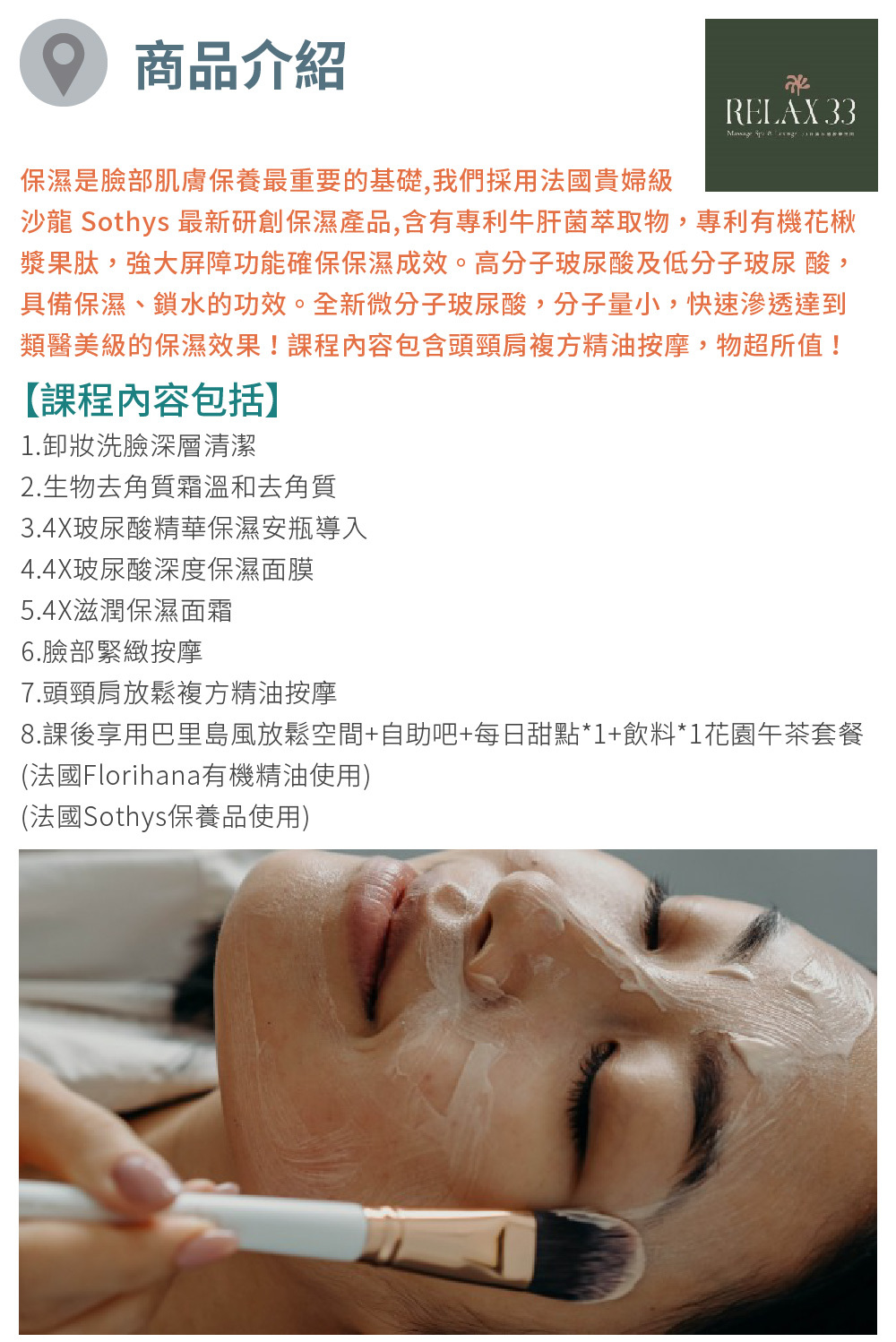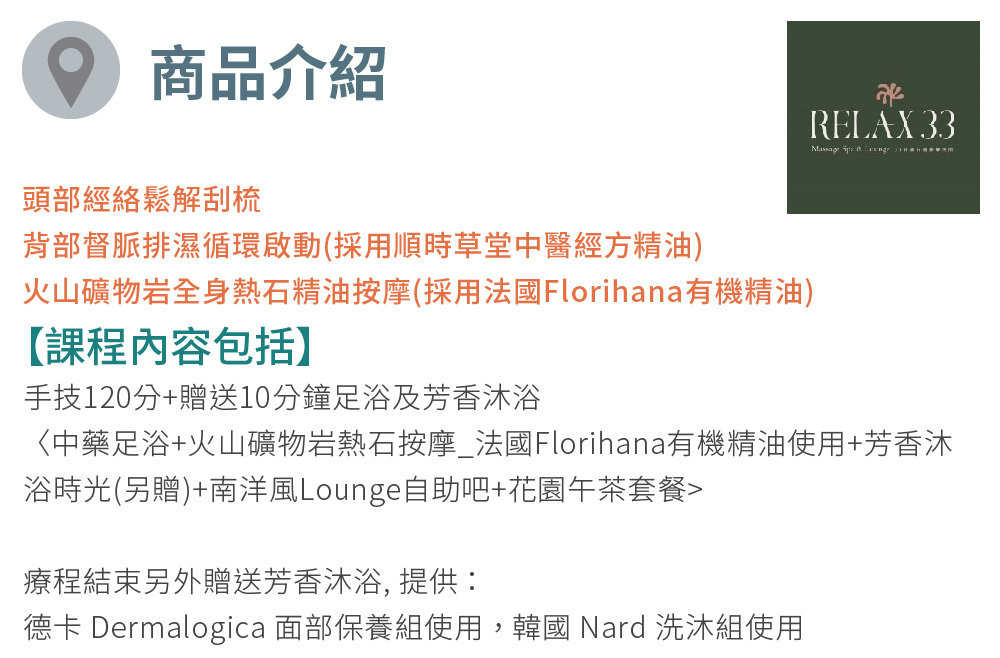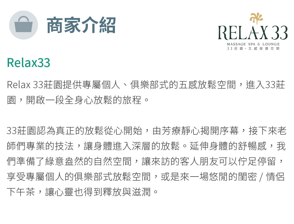 Relax 33 莊園提供莊園式芳療深層放鬆,足浴、肩頸頭按摩、舒壓開背、全身經絡放鬆、四隻書活筋脈指壓按摩、養生茶點等等。