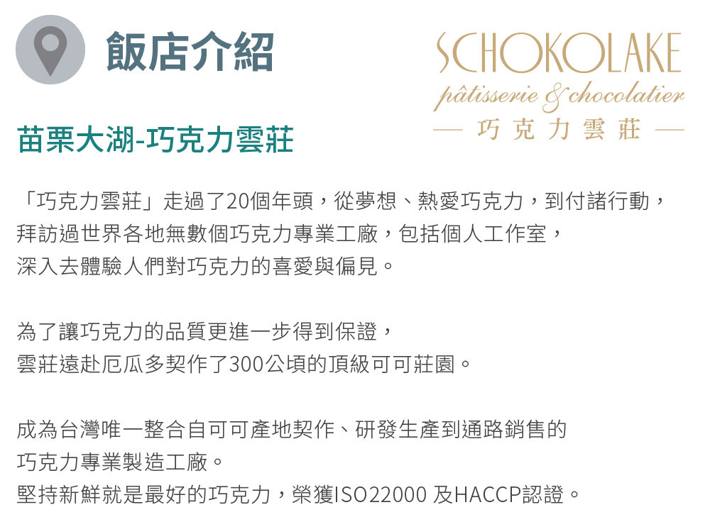 台灣唯一整合自可可產地契作、研發生產到通路銷售的巧克力專業工廠,提供各式美味高品質的巧克力、甜點與蛋糕,生巧克力更是長年的熱銷商品,可依據喜好選擇口味。
