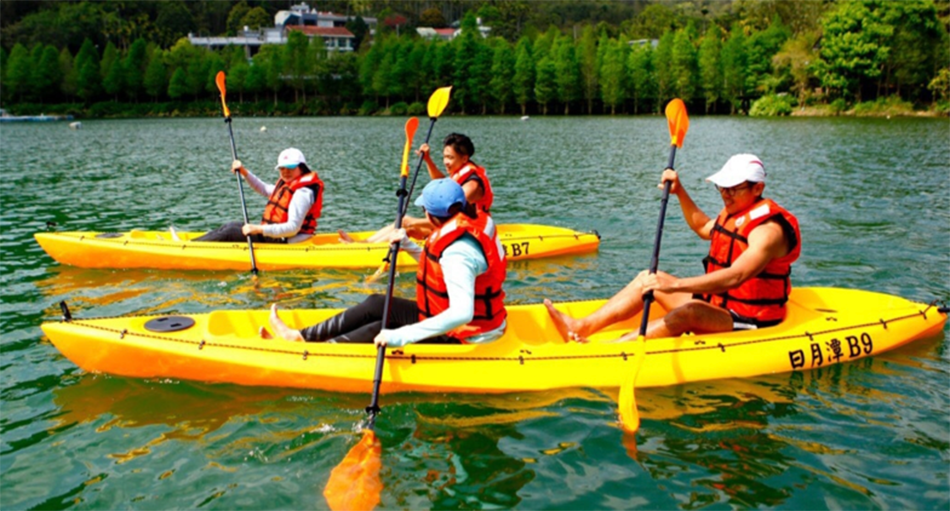在美麗的日月潭,想要有別於觀光船艇、纜車或腳踏車的遊玩方式,可千萬別錯過獨木舟體驗,與三五好友一起划在幽靜的湖泊上,享受歡樂的時光。