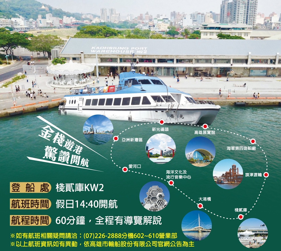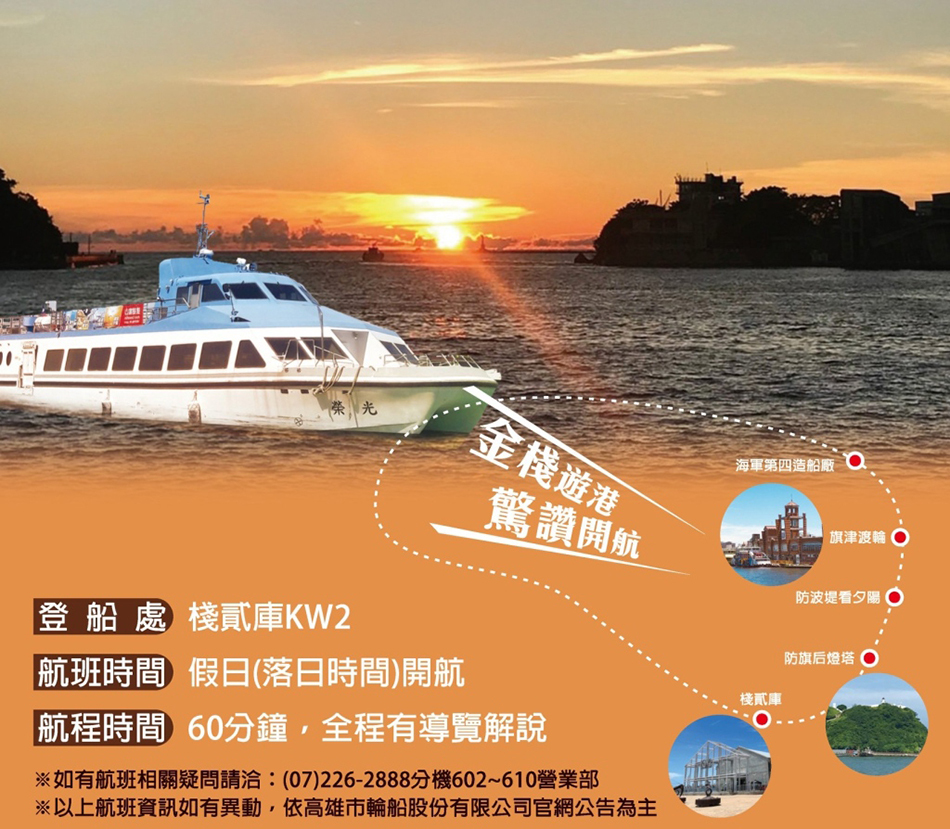 高雄港不僅為國際港口,還身兼軍港、漁港等多功能身分,高雄港的觀光航班是旅客來到高雄最喜愛的行程之一!假日傍晚的「金棧遊港」航班,即為從夕陽鍍「金」的「棧」貳庫開航,除了能夠欣賞高雄港海平線的金黃夕陽,還有專業導覽解說介紹高雄港都的歷史與文化。